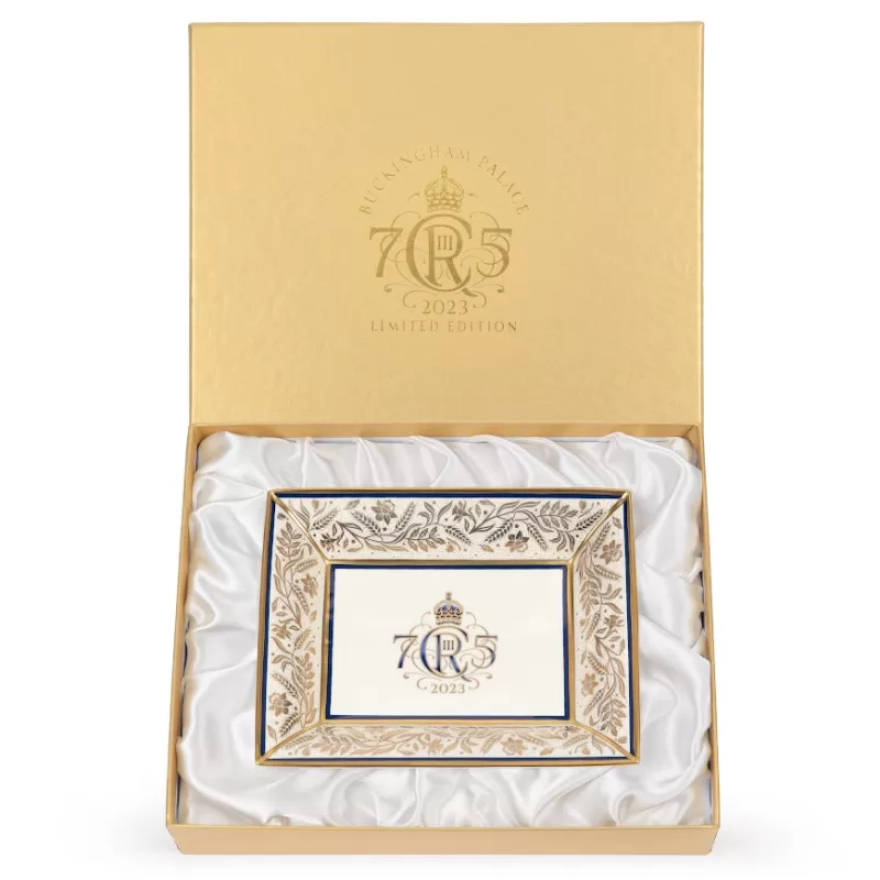 A Limited Edition Of Only 75, This Fine Bone China Desk Tray Is A Unique And Charming Keepsake. At Its Centre Is A Special Variation Of The King’S Cypher Designed To Mark His Majesty’S 75Th Birthday. Surrounded By Oak Leaves And Wheat Ears Representing Strength And Prosperity, With A Border Of Navy And Gold And Hand Finished With 22 Carat Gold Elevates The Whole Piece.