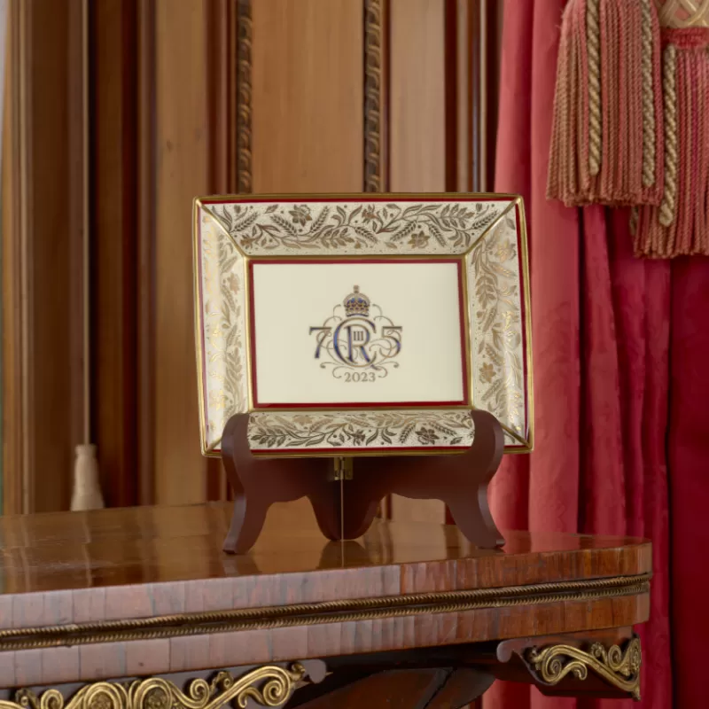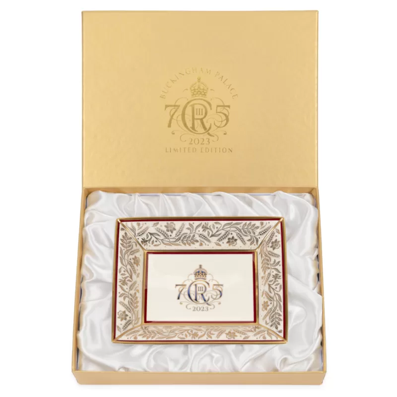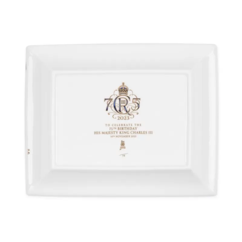 A Limited Edition Of Only 75, This Fine Bone China Desk Tray Is A Unique And Charming Keepsake. At It’S Centre Is A Special Variation Of The King’S Cypher Designed To Mark His Majesty’S 75Th Birthday. Surrounded By Oak Leaves And Wheat Ears Representing Strength And Prosperity, With A Border Of Red And Gold And Hand Finished With 22 Carat Gold Elevates The Whole Piece.